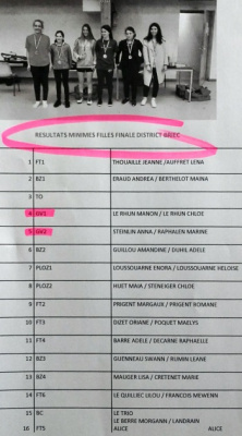 L’équipe championne départementale (Mathilde Madec, Enora Stéphan et Juliette Stéphan) disputera les championnats académiques qui auront lieu Mercredi 18 Mars à Lorient.