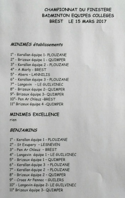 Voici les résultats de la compétition de Badminton qui s’est déroulée le mercredi 8 avril 2015 à Briec.