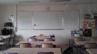 Les travaux d’été ont débuté en salle 103 où l’estrade maçonnée (la dernière de l’établissement) a été démontée par une entreprise mandatée par le Conseil général. Les estrades sont désormais interdites car incompatibles avec la circulation des personnes à mobilité réduite. La photographie ci-dessous vous montre le volume des gravats générés par la destruction de l’estrade. Mme Le Gall, Professeure de lettres classiques, va perdre un peu de hauteur mais uniquement en altitude !