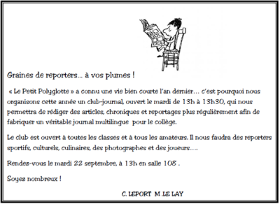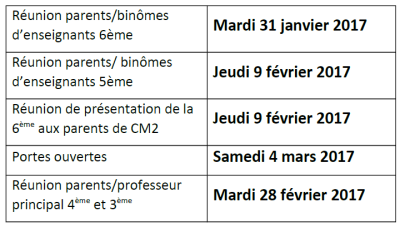 - Une réunion pour les parents d’élèves de 6e est également prévue le jeudi 5 septembre à 18h. M. Masson, le nouveau principal et les professeurs principaux présenteront l’année de 6e aux responsables légaux.